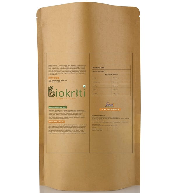 Nutriblend atta is a blend of whole wheat and black wheat offering several health benefits, including high fiber content, increased protein intake, and improved digestion. Black wheat has higher protein, dietary fiber, vitamin K, antioxidant, and mineral content than conventional wheat.